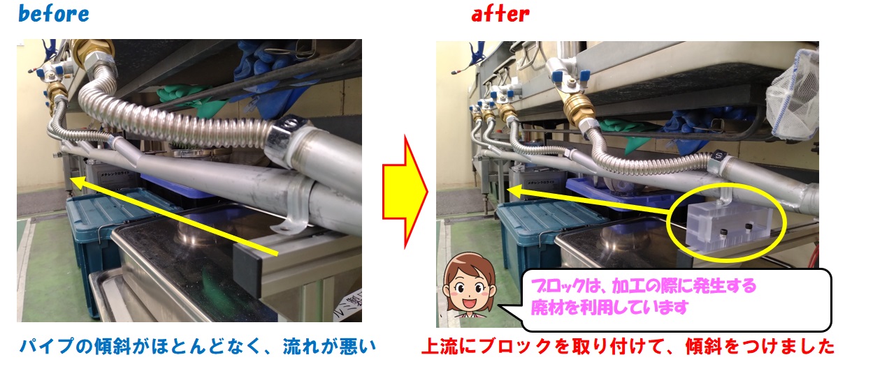 流速が遅いため、廃棄に15分以上の時間がかかっていました」「この問題を解決するため、流路パイプに傾斜をつけてみようと考えました」