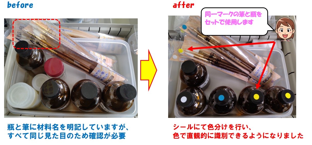 「そこで色シールで溶剤と道具を色分けして、紐づけすることを思いつきました」