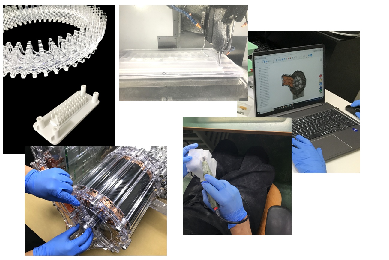 「実は、モータコイルやギヤ部品等、本来金属でできている部品も樹脂切削品、造形品で